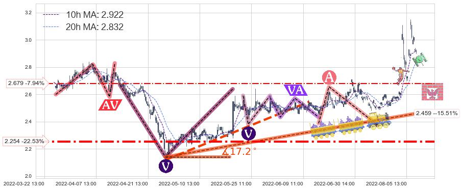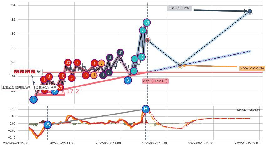 ♘ 在最后的上升阶段2022-04-27 09:00至2022-08-12 14:00存在 持续未破位的支撑位 ,支撑价格2.459,支撑可信任强度81.96%,其距离最后价格2.910相差 -15.51%