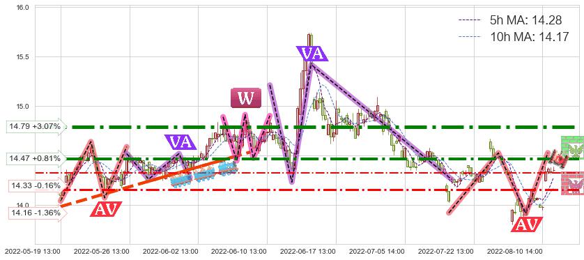 ♘ 阻力价格位14.47,可信任强度70.34%,距离最后交易2022-08-12 14:00形成的收盘价格14.35相差 +0.81%