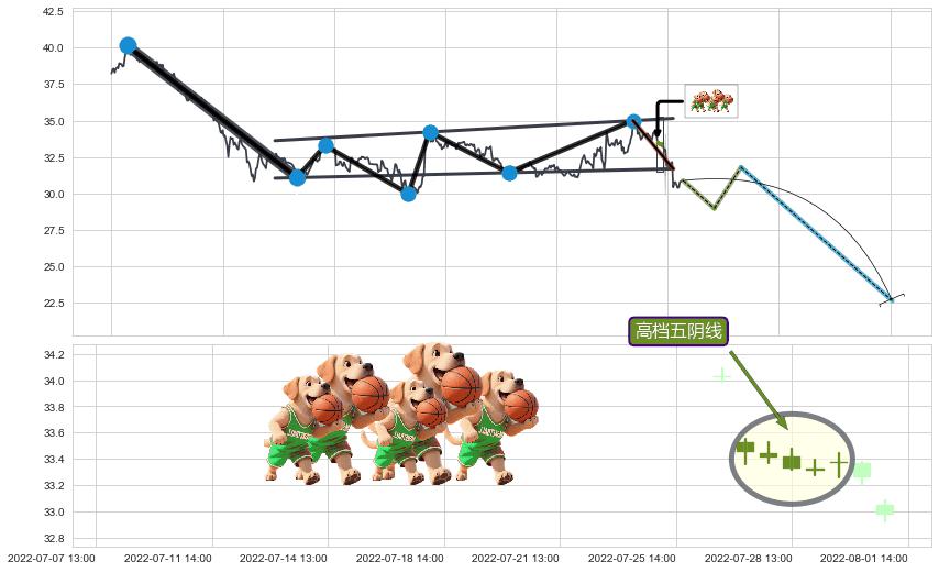 | 3 🅚:射击之星形态 ➕ 📐:升旗形下行突破支撑位破位, 猜想持续下沉下跌,被突破的支撑位已变为阻力位 ☞ 看空信号 ⇥ 【🅚线】交织【图形】⇥ 综合量化分数: 36 | > |