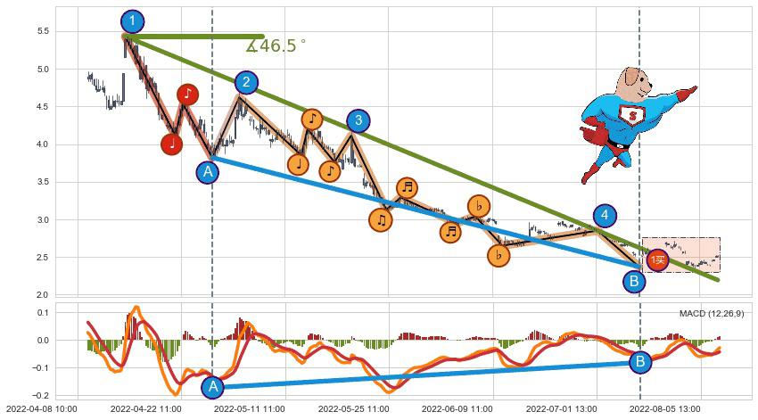 从2022-04-15 09:00至2022-07-21 14:00,共包含257个小时,阶段股价下跌-70.50%,阶段股价变动位移路程比: 1 : 4,下跌趋势角度: 46.5