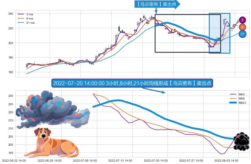 ⚀ 2022-07-06 13:00:00小时-2022-08-03 14:00:00小时显现 3小时-8小时-21小时均线 【乌云密布】卖出点 看空信号,后市看跌,卖出