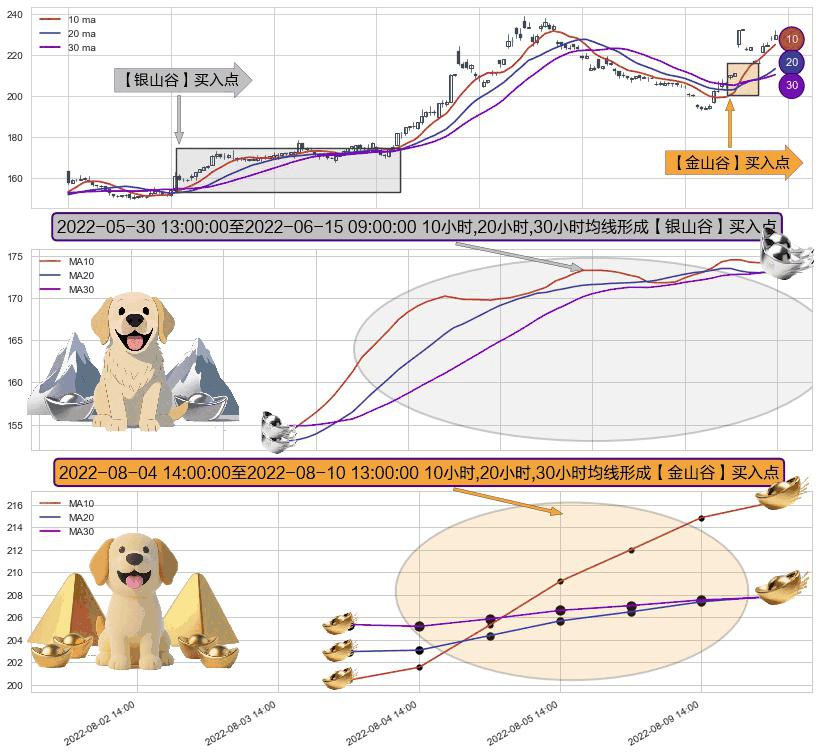 ⚀ 2022-08-05 13:00:00-小时至2022-08-10 13:00:00-小时显现 10小时-20小时-30小时均线 【金山谷】买入点 其再次确认了买入信号,可靠性更强,买入