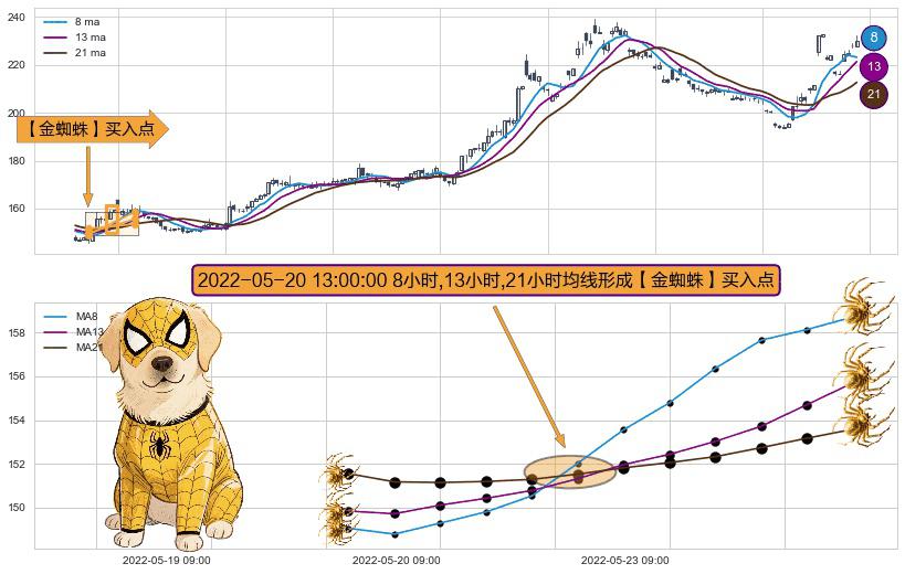 ⚀ 2022-05-20 13:00:00小时显现 8小时-13小时-21小时均线 【金蜘蛛】买入点 看多信号,后市看涨,买入