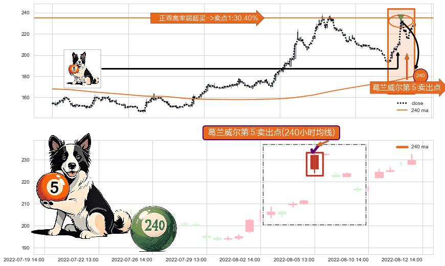 ⚀ 2022-08-05 13:00:00-小时显现 葛兰威尔均线 240小时均线 第⑤卖出点 上升趋势均值回复的短线回落信号,后市看跌,卖出信号