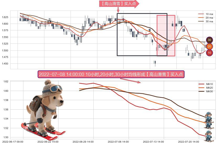 ⚀ 2022-06-27 14:00:00小时-2022-07-21 14:00:00小时显现 10小时-20小时-30小时均线 【高山滑雪】买入点 看多信号,后市看涨,买入