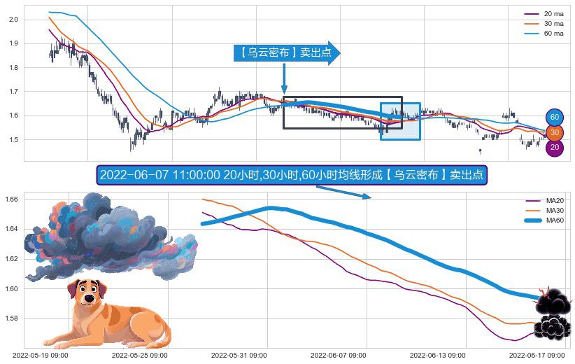 ⚀ 2022-05-26 11:00:00小时-2022-06-16 10:00:00小时显现 20小时-30小时-60小时均线 【乌云密布】卖出点 看空信号,后市看跌,卖出