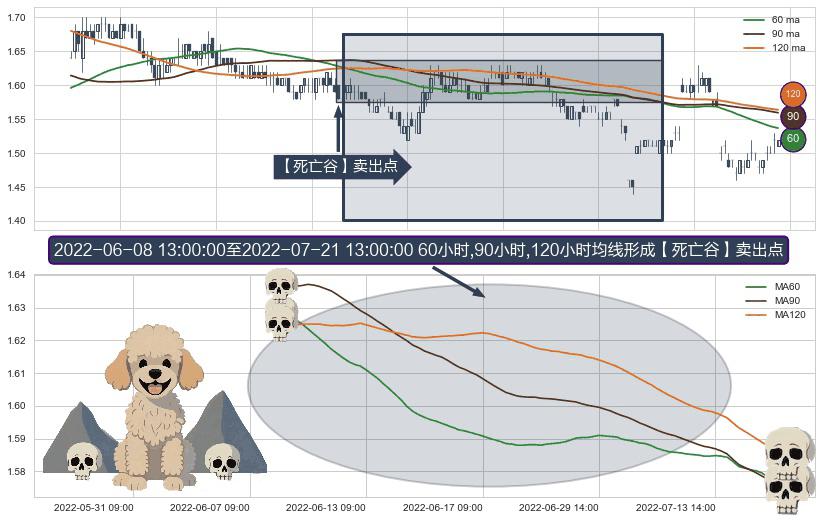⚀ 2022-06-08 14:00:00-小时至2022-07-21 13:00:00-小时显现 60小时-90小时-120小时均线 【死亡谷】卖出点 看空信号,后市看跌,卖出