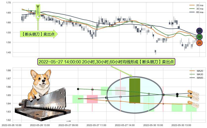 ⚀ 2022-05-27 14:00:00小时显现 20小时-30小时-60小时均线 【断头铡刀】卖出点 看空信号,后市看跌,卖出