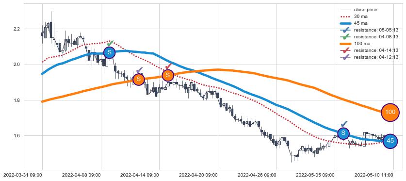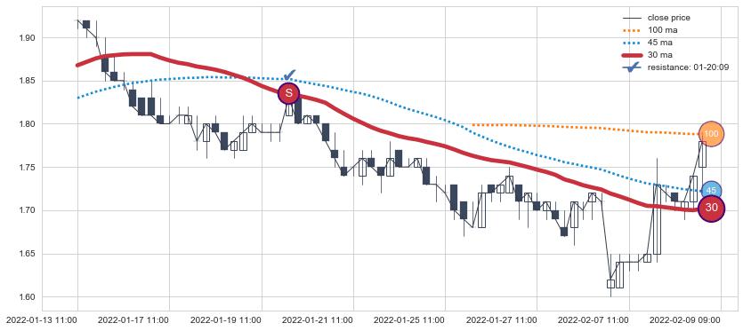 ⚂ 2022-07-27 13:00:00-小时均线向上突破,2022-07-29 14:00:00-小时重新下穿均线破位,均线阻力再次生效