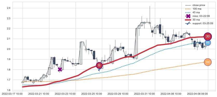 ⚅ 卖点向下突破均线后,价格走势有持续向下的迹象,但动能稍显不足,迟迟不能远离均线