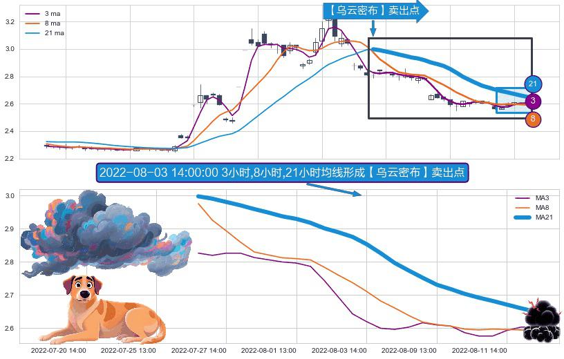 ⚀ 2022-07-26 14:00:00小时-2022-08-12 14:00:00小时显现 3小时-8小时-21小时均线 【乌云密布】卖出点 看空信号,后市看跌,卖出