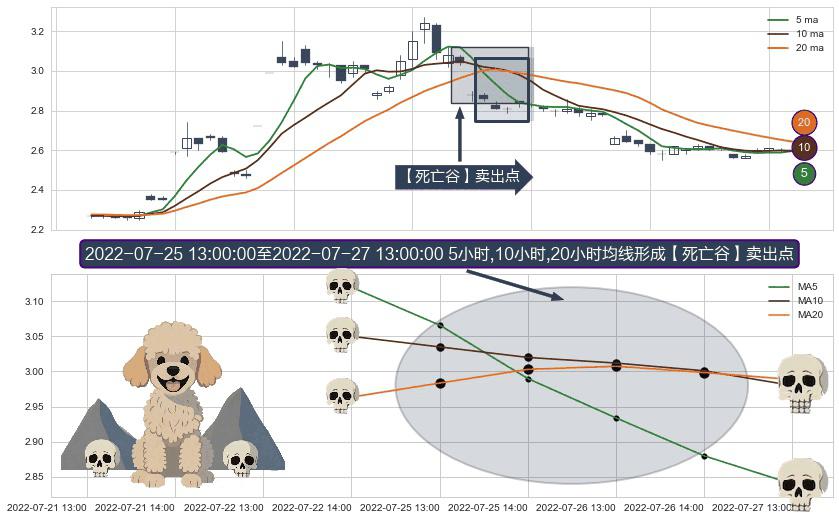 ⚀ 2022-07-25 14:00:00-小时至2022-07-27 13:00:00-小时显现 5小时-10小时-20小时均线 【死亡谷】卖出点 看空信号,后市看跌,卖出