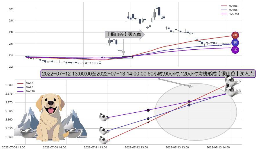 ⚀ 2022-07-13 13:00:00-小时至2022-07-13 14:00:00-小时显现 60小时-90小时-120小时均线 【银山谷】买入点 看多信号,后市看涨,买入