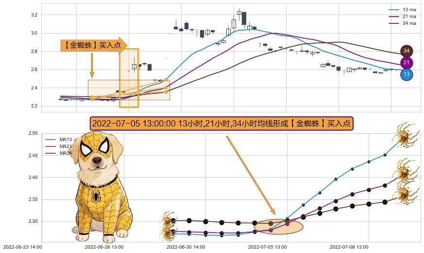 ⚀ 2022-07-05 13:00:00小时显现 13小时-21小时-34小时均线 【金蜘蛛】买入点 看多信号,后市看涨,买入