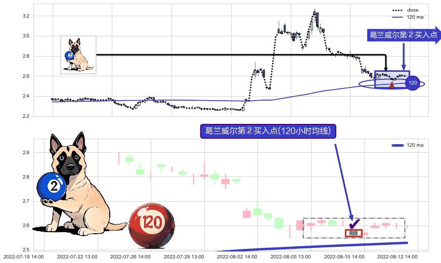 ⚀ 2022-08-10 13:00:00-小时显现 葛兰威尔均线 120小时均线 第②买入点 上升趋势的中继信号,后市看涨,买进信号