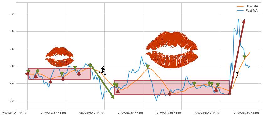 03-24 13:00至07-04 14:00 慢线与快线多次接触,存在上下穿越,有缠绕