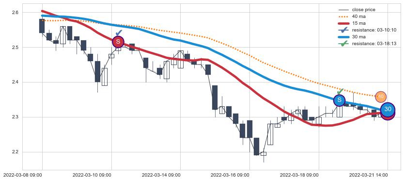 03-08 09:00至03-24 13:00 慢线与快线呈空头排列, 慢线与快线接触少,无缠绕