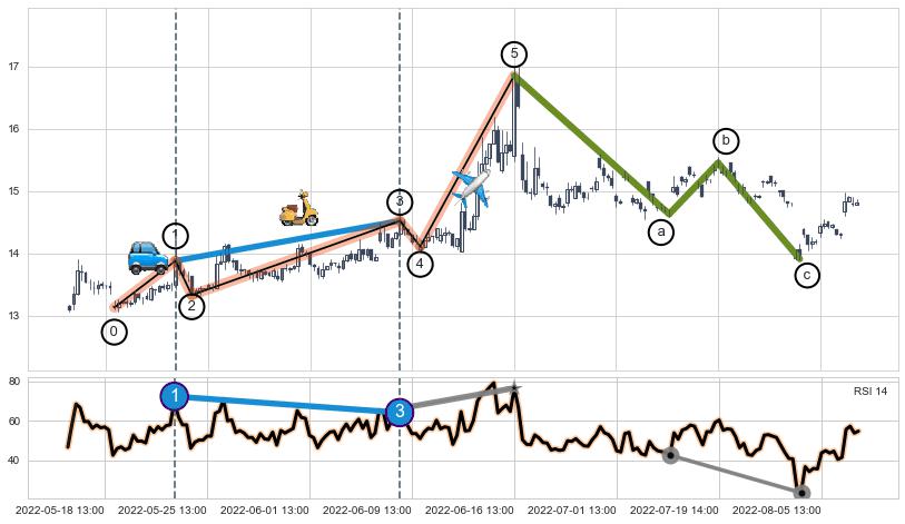 ➢ 第一, 三驱动浪端点:【RSI】走势出现【常规背离 & 反转信号】背离程度44.14%,背离夹角角度41.1˚,背离程度较大