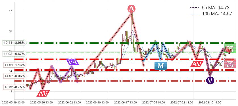♘ 阻力价格位14.92,可信任强度52.23%,距离最后交易2022-08-12 14:00形成的收盘价格14.82相差 +0.67%