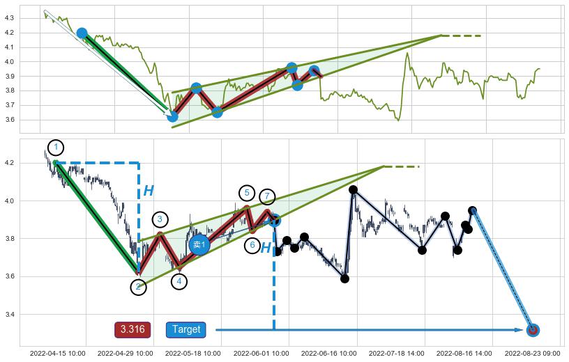 ➢ 最小中继整理跌幅→𝐇: 0.5800 (𝐇楔型旗杆的长度:楔型起点→顶点)