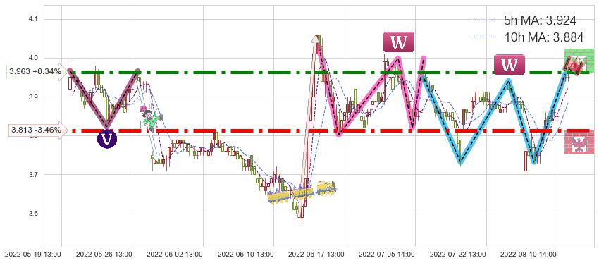 ♘ 阻力价格位3.963,可信任强度87.81%,距离最后交易2022-08-12 14:00形成的收盘价格3.950相差 +0.34%