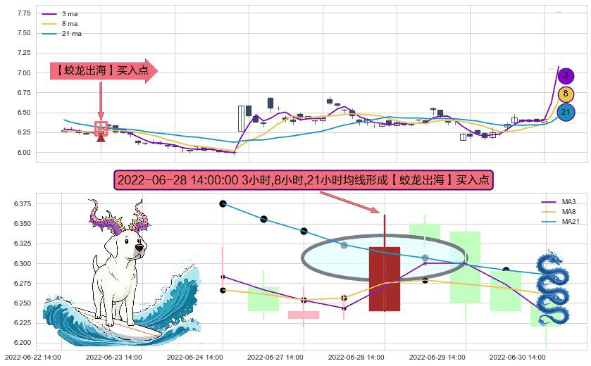 形态多维评估: ⚀ 2022-06-28 14:00:00小时显现 3小时-8小时-21小时均线 【蛟龙出海】买入点 看多信号,后市看涨,买入