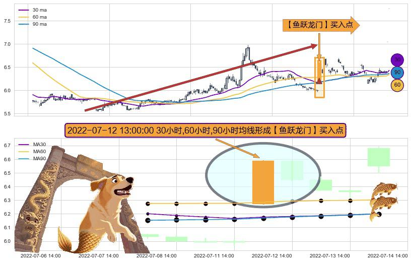 形态多维评估: ⚀ 2022-07-12 13:00:00小时显现 30小时-60小时-90小时均线 【鱼跃龙门】买入点 看多信号,后市看涨,买入
