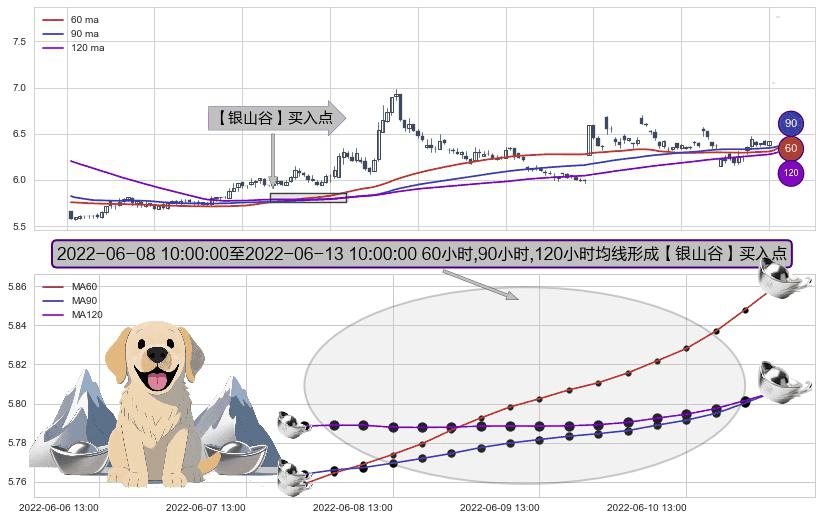 形态多维评估: ⚀ 2022-06-08 11:00:00-小时至2022-06-13 10:00:00-小时显现 60小时-90小时-120小时均线 【银山谷】买入点 看多信号,后市看涨,买入