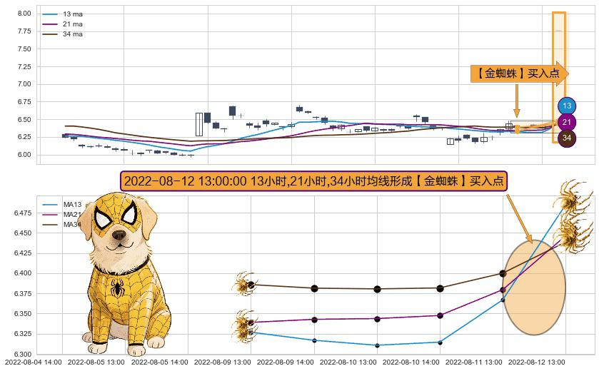 形态多维评估: ⚀ 2022-08-12 13:00:00小时显现 13小时-21小时-34小时均线 【金蜘蛛】买入点 看多信号,后市看涨,买入