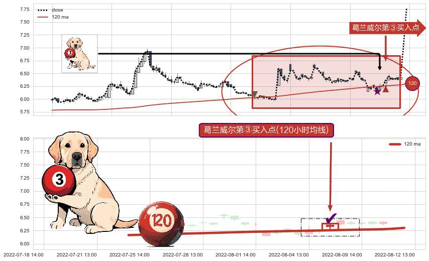 形态多维评估: ⚀ 2022-08-05 13:00:00-小时显现 葛兰威尔均线 120小时均线 第③买入点 上升趋势的中继信号,后市看涨,买进信号
