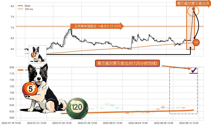 形态多维评估: ⚀ 2022-08-12 13:00:00-小时显现 葛兰威尔均线 120小时均线 第⑤卖出点 上升趋势均值回复的短线回落信号,后市看跌,卖出信号
