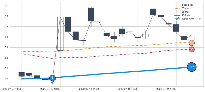 上涨趋势07-07 14:00-07-22 14:00,均线135确认关键支撑1处