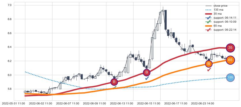 上涨趋势05-31 11:00-06-28 13:00,均线65, 35确认关键支撑3处
