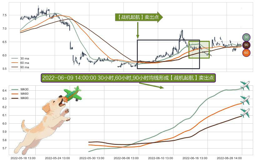 形态多维评估: ⚀ 2022-05-26 14:00:00小时-2022-06-28 14:00:00小时显现 30小时-60小时-90小时均线 【战机起航】卖出点 看空信号,后市看跌,卖出