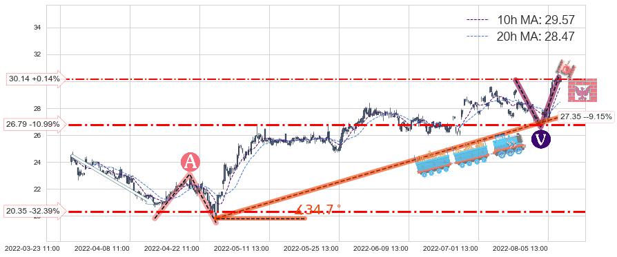 ♘ 在最后的上升阶段2022-04-26 14:00至2022-08-12 14:00存在 持续未破位的支撑位 ,支撑价格27.35,支撑可信任强度82.28%,其距离最后价格30.10相差 -9.15%