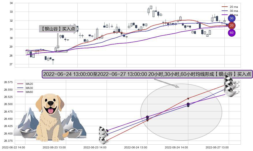 形态多维评估: ⚀ 2022-06-24 14:00:00-小时至2022-06-27 13:00:00-小时显现 20小时-30小时-60小时均线 【银山谷】买入点 看多信号,后市看涨,买入