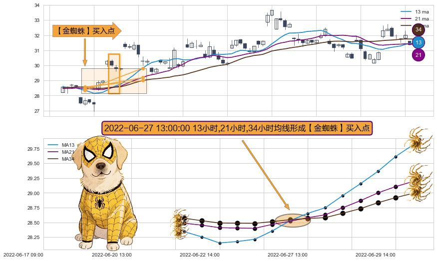 形态多维评估: ⚀ 2022-06-27 13:00:00小时显现 13小时-21小时-34小时均线 【金蜘蛛】买入点 看多信号,后市看涨,买入