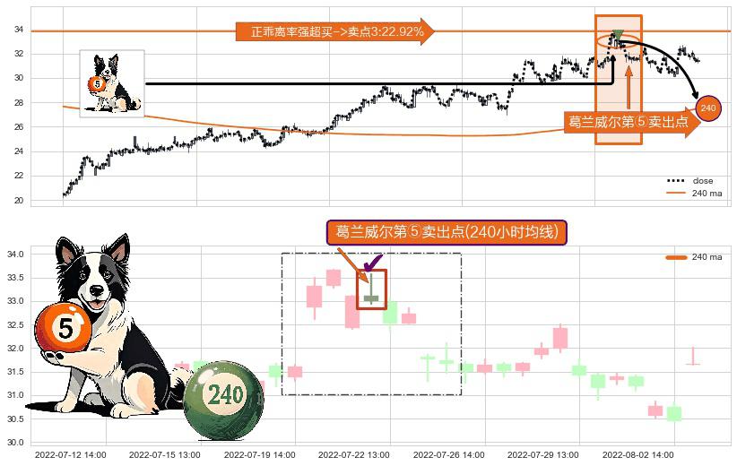 形态多维评估: ⚀ 2022-07-21 14:00:00-小时显现 葛兰威尔均线 240小时均线 第⑤卖出点 上升趋势均值回复的短线回落信号,后市看跌,卖出信号