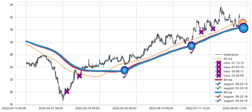 上涨趋势04-13 09:00-08-09 13:00,均线90, 95确认关键支撑2处