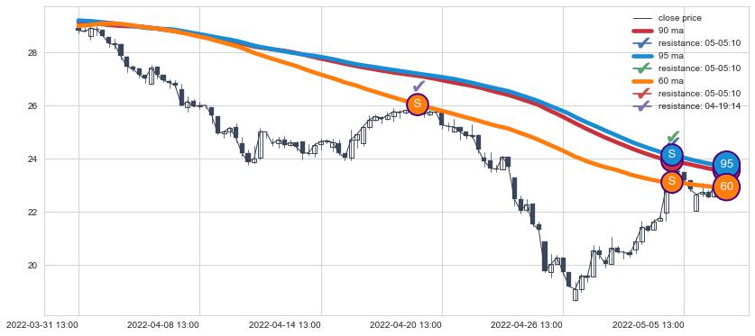 下跌趋势03-31 13:00-05-06 13:00,均线90, 60, 95确认关键阻力2处