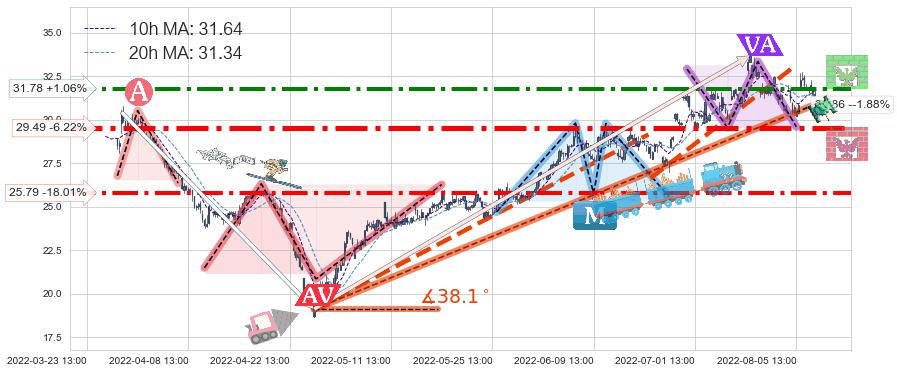 🍖 长线趋势跟踪组合短线均值回复[强支撑信号]2022-04-27 09:00-2022-08-04 14:00上升趋势依然成立(上涨趋势跟踪依然可行),短线价格略微下行回调(均值回复猜想),即将接近趋势提供的未破位的支撑价格:30.86。