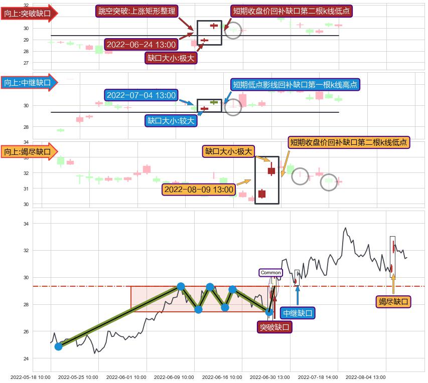 ➣ 跳空后首先朝【突破反向回撤】方向,之后缺口再次起到影响朝【突破目标达成】方向