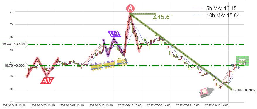 ➣ 2022-06-15 13:00-2022-08-10 14:00下跌趋势存在反转上涨[机会],其原下跌趋势的阻力位(14.86)已被突破[强支撑信号],原下跌趋势角度: 45.6˚