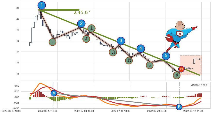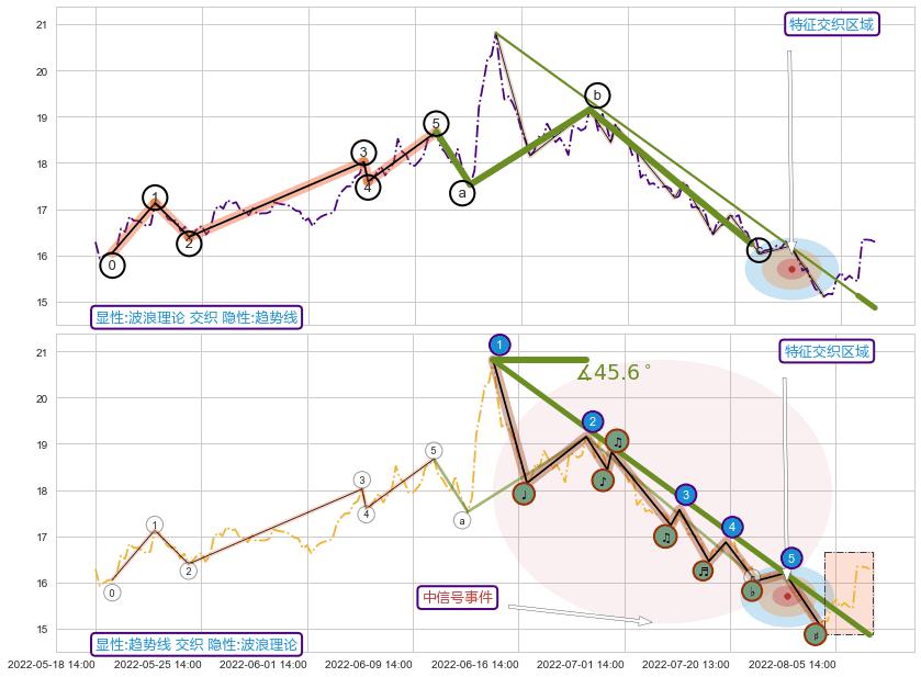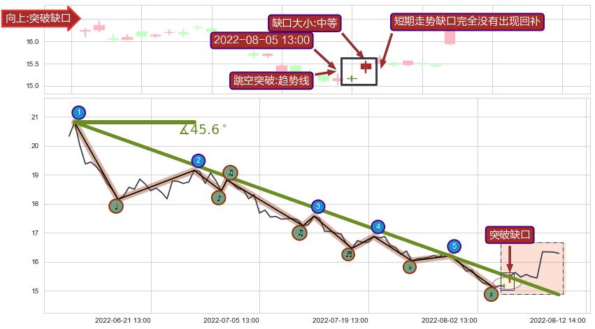 从2022-06-15 13:00至2022-08-10 14:00,共包含86个小时,阶段股价下跌-29.09%,阶段股价变动位移路程比: 1 : 2,下跌趋势角度: 45.6