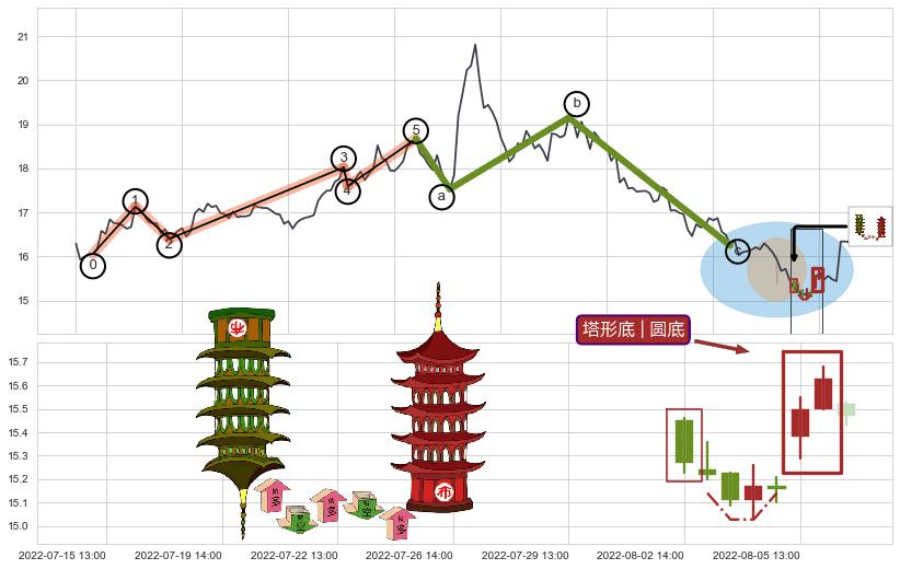 | 9 🅚:塔形底 | 圆底 ➕ 📈:趋势线下跌趋势原阻力已出现突破,猜想原阻力已变为支撑位(大周期均值回复) ☞ 看多信号 ⇥ 【🅚线】交织【图形】⇥ 综合量化分数: 55 | > |