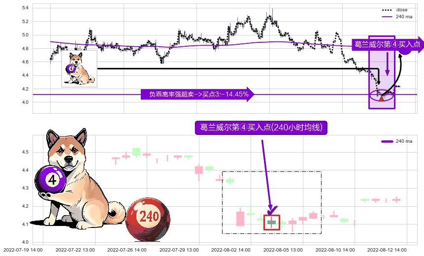 形态多维评估: ⚀ 2022-08-03 14:00:00-小时显现 葛兰威尔均线 240小时均线 第④买入点 下降趋势均值回复的短线反弹信号,后市看涨,买进信号