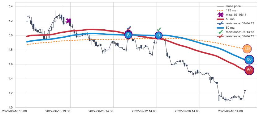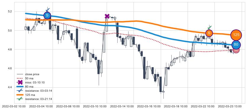 下跌趋势03-02 10:00-03-23 13:00,均线80, 125确认关键阻力2处