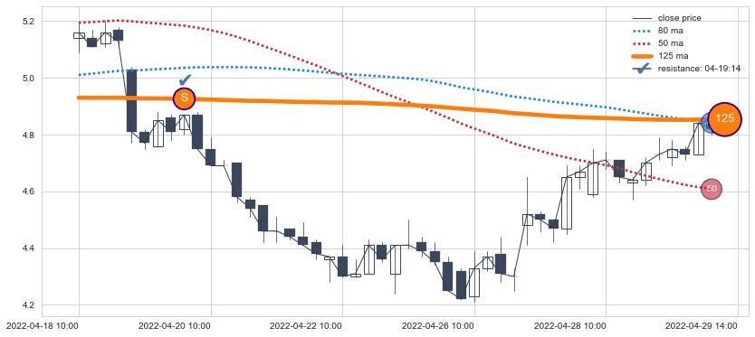 下跌趋势04-18 10:00-04-29 14:00,均线125确认关键阻力1处