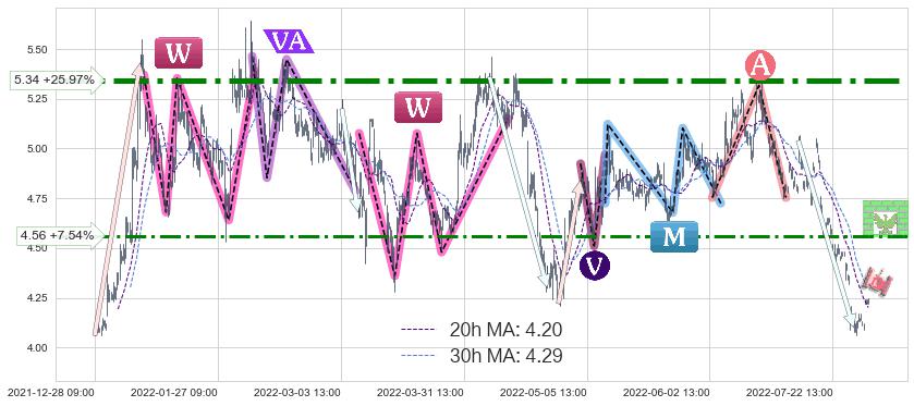 ♞ 20小时均线:4.20,30小时均线:4.29→ 快线<慢线