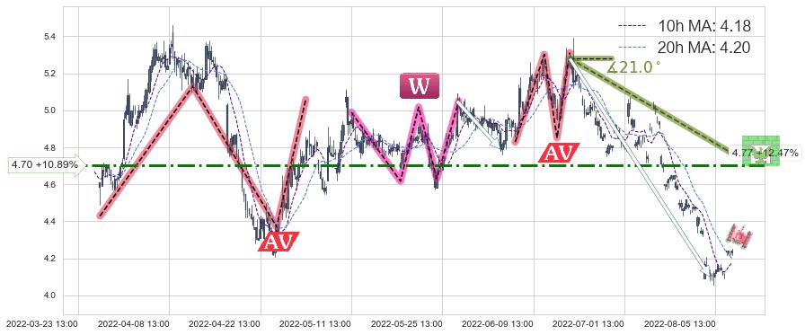 2022-07-11: 第一阻力位4.70有效抑制了下跌浪,成功阻止了价格的继续下跌。